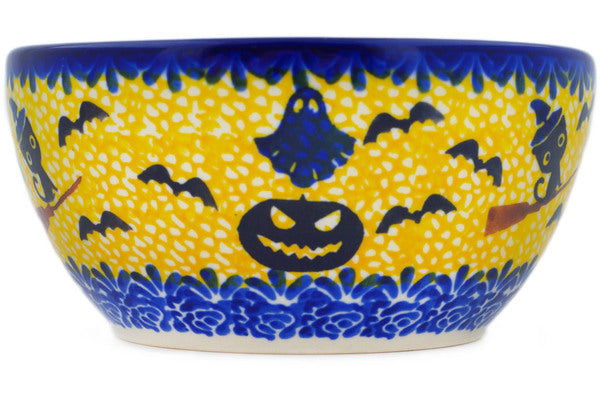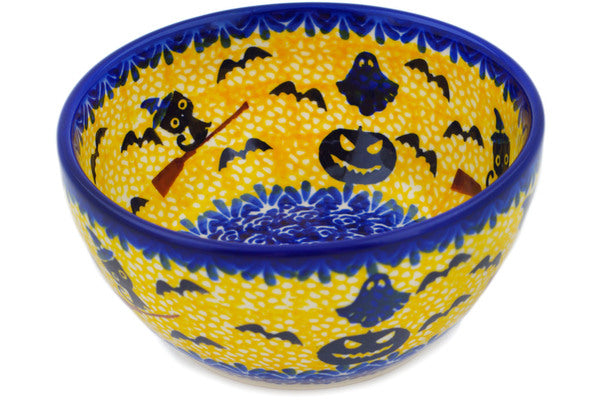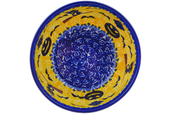 This Polish Pottery Bowl is handmade and handpainted by the Ceramika Nina factory in Boleslawiec, Poland. Manufacturer item number H3287P. It is 2¼" high and measures 5¼" by 5¼". The capacity of this Bowl is 13.53 oz (brimful) and it weighs 0.8 lbs. It is part of the Halloween Evening Collection.
