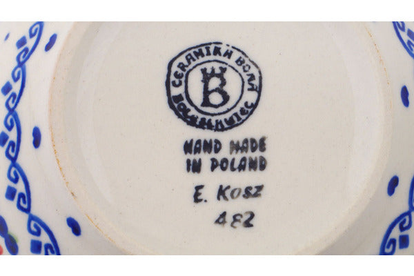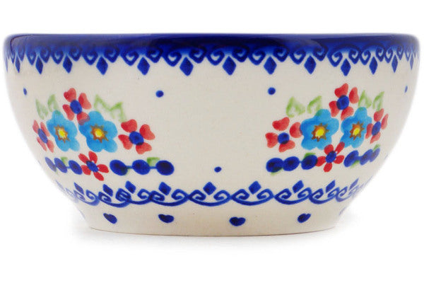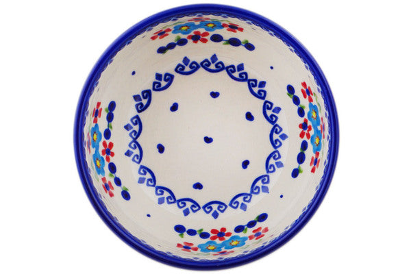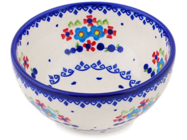 This Polish Pottery Bowl is handmade and handpainted by the Ceramika Bona factory in Boleslawiec, Poland. Manufacturer item number H0300Q. It is 2½" high and measures 5¼" by 5¼". The capacity of this Bowl is 16.23 oz (brimful) and it weighs 0.7 lbs. It is part of the Hearts And Flowers Collection.