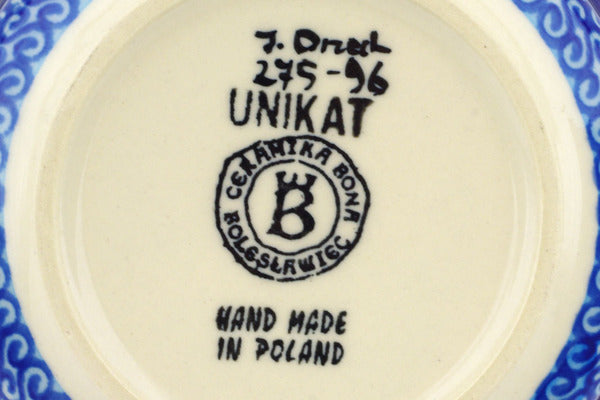 This Polish Pottery Bowl is handmade and handpainted by the Ceramika Bona factory in Boleslawiec, Poland. Manufacturer item number H3257J. It is 2¼" high and measures 5¼" by 5¼". The capacity of this Bowl is 15.49 oz (brimful) and it weighs 0.8 lbs. It is part of the Midnight Eclipse Collection.