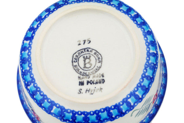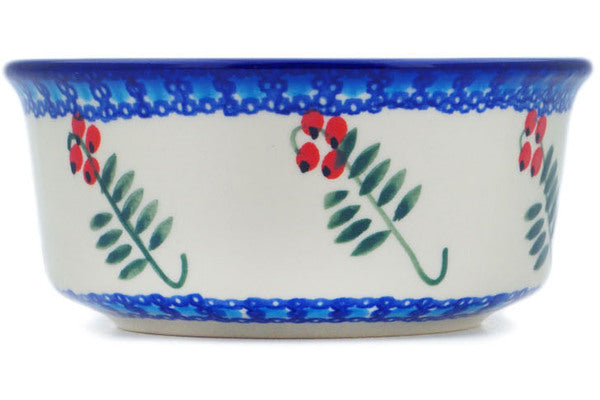 This Polish Pottery Bowl is handmade and handpainted by the Ceramika Bona factory in Boleslawiec, Poland. Manufacturer item number H0078R. It is 2¼" high and measures 5¼" by 5¼". The capacity of this Bowl is 15.49 oz (brimful) and it weighs 0.8 lbs. It is part of the Red Berries Collection.