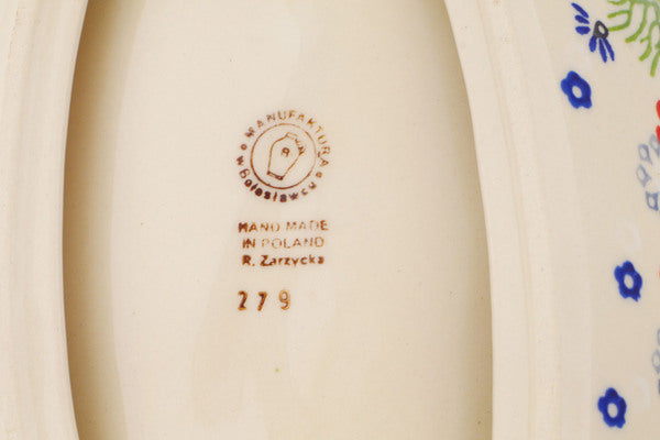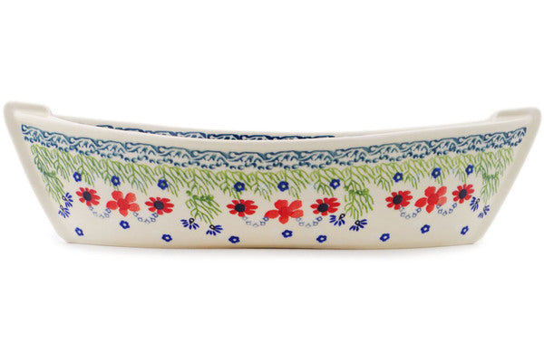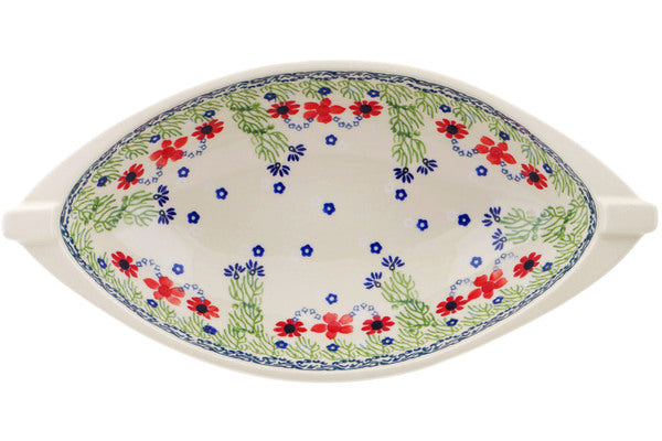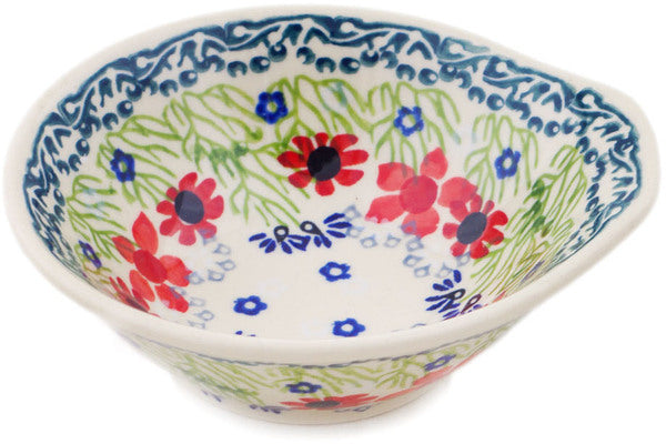 This Polish Pottery Bowl is handmade and handpainted by the Manufaktura factory in Boleslawiec, Poland. Manufacturer item number H8566P. It is 1¾" high and measures 5¼" by 5". The capacity of this Bowl is 5.27 oz (brimful) and it weighs 0.5 lbs. It is part of the Red Blossom Collection.