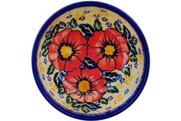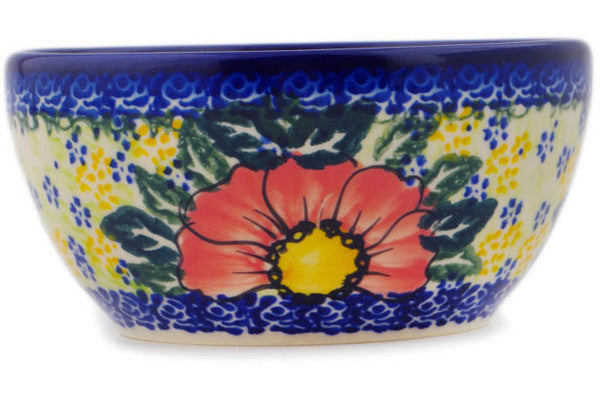 This Polish Pottery Bowl is handmade and handpainted by the Ceramika Nina factory in Boleslawiec, Poland. Manufacturer item number H1875P. It is 2¼" high and measures 5¼" by 5¼". The capacity of this Bowl is 13.53 oz (brimful) and it weighs 0.8 lbs. It is part of the Red Daisy Delight Collection.
