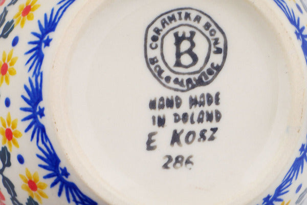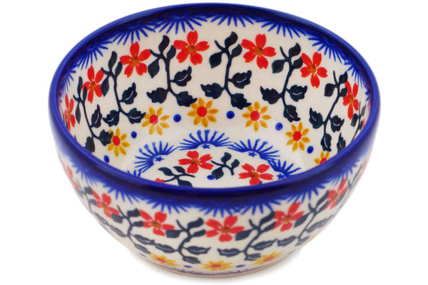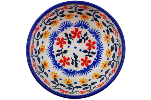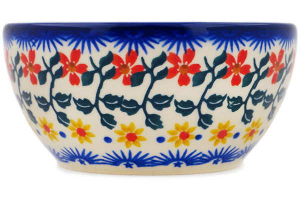 This Polish Pottery Bowl is handmade and handpainted by the Ceramika Bona factory in Boleslawiec, Poland. Manufacturer item number H4122Q. It is 2" high and measures 4¼" by 4". The capacity of this Bowl is 7.30 oz (brimful) and it weighs 0.4 lbs. It is part of the Red Sunflower Collection.