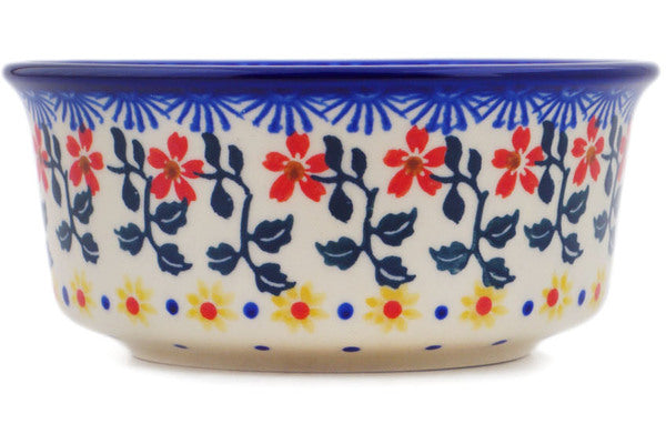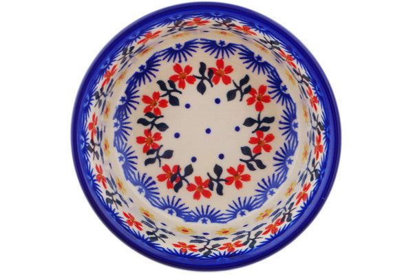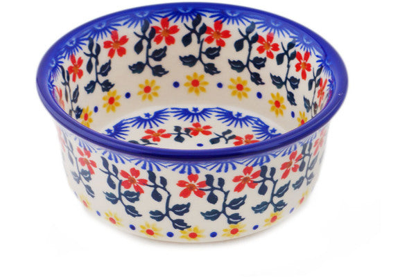 This Polish Pottery Bowl is handmade and handpainted by the Ceramika Bona factory in Boleslawiec, Poland. Manufacturer item number H4161Q. It is 2¼" high and measures 5¼" by 5¼". The capacity of this Bowl is 15.49 oz (brimful) and it weighs 0.8 lbs. It is part of the Red Sunflower Collection.