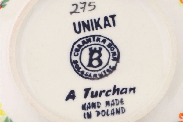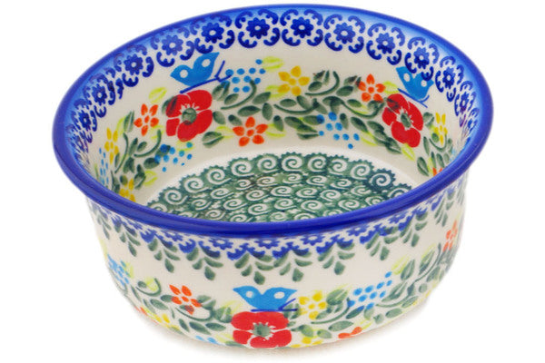 This Polish Pottery Bowl is handmade and handpainted by the Ceramika Bona factory in Boleslawiec, Poland. Manufacturer item number H0171Q. It is 2¼" high and measures 5¼" by 5¼". The capacity of this Bowl is 15.49 oz (brimful) and it weighs 0.8 lbs. It is part of the Ring Of Meadow Flowers Collection.