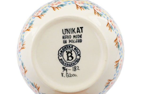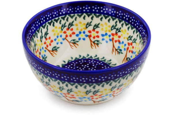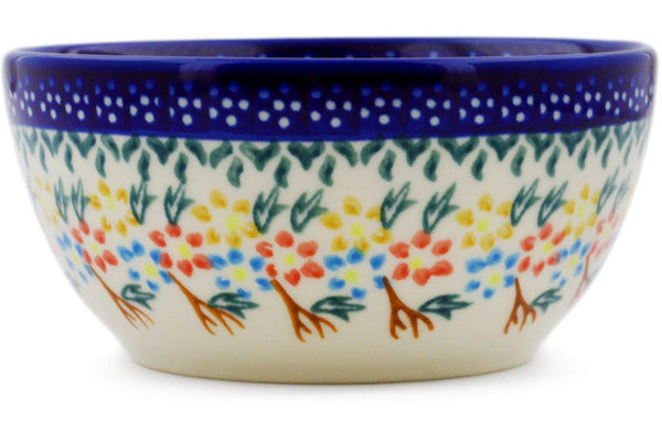 This Polish Pottery Bowl is handmade and handpainted by the Ceramika Bona factory in Boleslawiec, Poland. Manufacturer item number H0449K. It is 2¼" high and measures 5¼" by 5¼". The capacity of this Bowl is 13.53 oz (brimful) and it weighs 0.8 lbs. It is part of the Spring Flower Ring Collection.