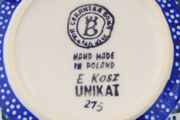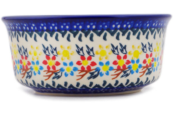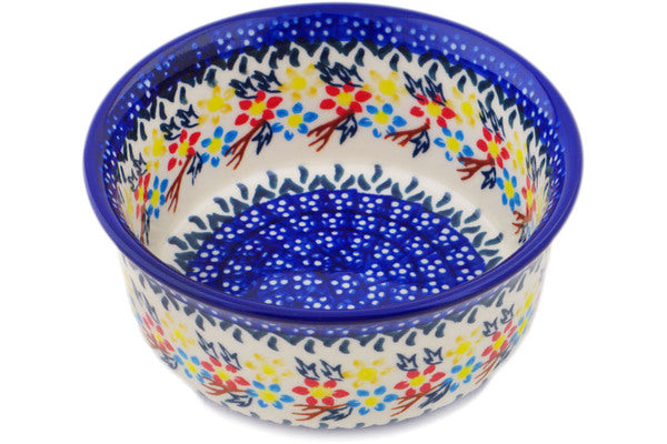 This Polish Pottery Bowl is handmade and handpainted by the Ceramika Bona factory in Boleslawiec, Poland. Manufacturer item number H6829P. It is 2¼" high and measures 5¼" by 5¼". The capacity of this Bowl is 15.49 oz (brimful) and it weighs 0.8 lbs. It is part of the Spring Flower Ring Collection.