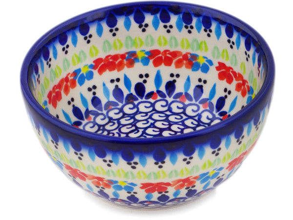 This Polish Pottery Bowl is handmade and handpainted by the Ceramika Bona factory in Boleslawiec, Poland. Manufacturer item number H2707Q. It is 2¼" high and measures 5¼" by 5¼". The capacity of this Bowl is 13.53 oz (brimful) and it weighs 0.8 lbs. It is part of the Spring Flowers Collection.
