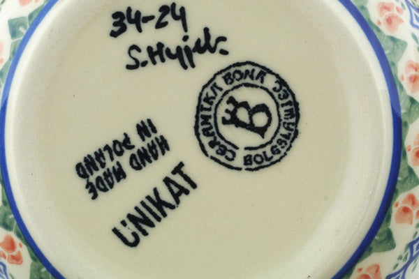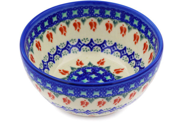 This Polish Pottery Bowl is handmade and handpainted by the Ceramika Bona factory in Boleslawiec, Poland. Manufacturer item number H7015E. It is 2¼" high and measures 5¼" by 5¼". The capacity of this Bowl is 13.53 oz (brimful) and it weighs 0.8 lbs. It is part of the Tulips And Diamonds Collection.
