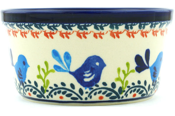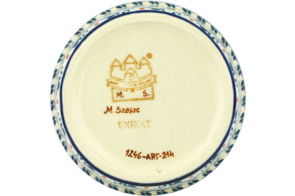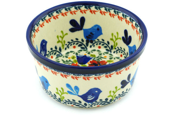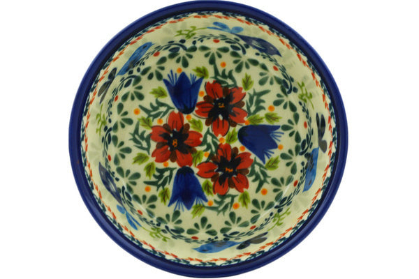 This Polish Pottery Bowl is handmade and handpainted by the Zaklady Ceramiczne factory in Boleslawiec, Poland. Manufacturer item number H8468H. It is 2½" high and measures 5" by 5". The capacity of this Bowl is 13.52 oz (brimful) and it weighs 0.8 lbs. It is part of the Vine Birds Collection.