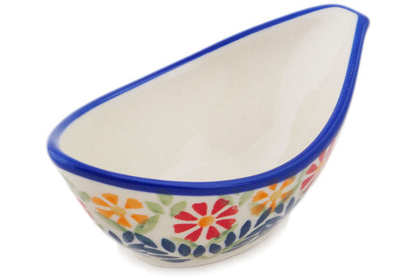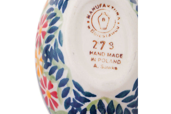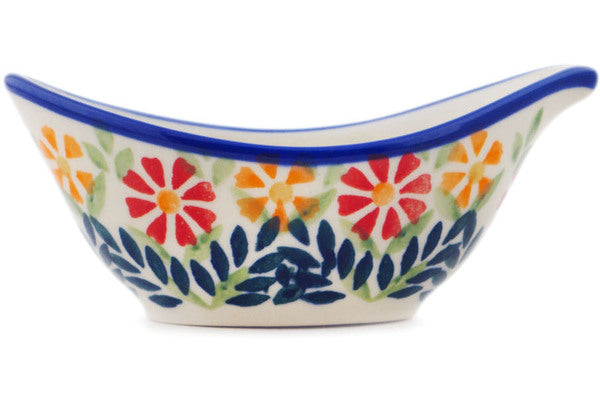 This Polish Pottery Bowl is handmade and handpainted by the Manufaktura factory in Boleslawiec, Poland. Manufacturer item number H7280P. It is 2" high and measures 4½" by 2¾". The capacity of this Bowl is 2.64 oz (brimful) and it weighs 0.3 lbs. It is part of the Wave Of Flowers Collection.