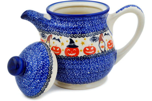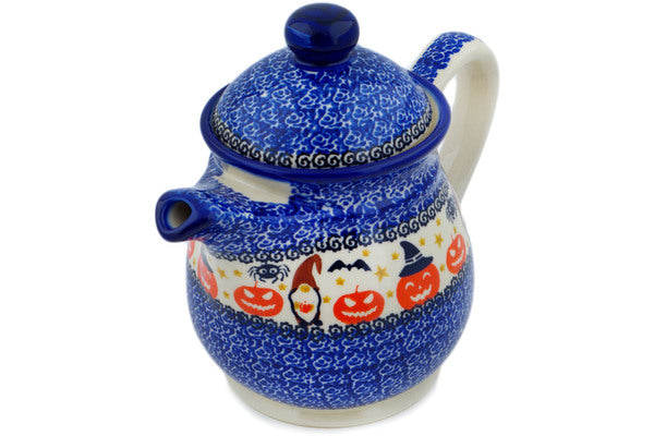 This Polish Pottery Tea or Coffee Pot is handmade and handpainted by the Ceramika Nina factory in Boleslawiec, Poland. Manufacturer item number H1509P. It is 8" high and measures 9½" by 5¾". The capacity of this Tea or Coffee Pot is 45.65 oz (brimful) and it weighs 3.1 lbs. It is part of the Harvest Haunt Collection.