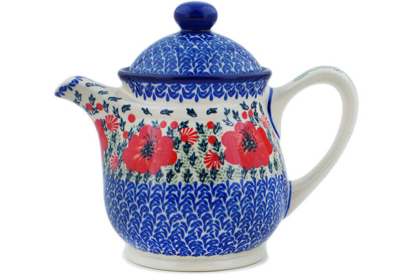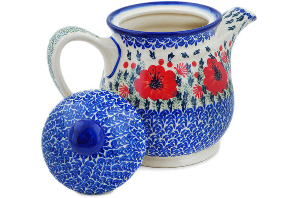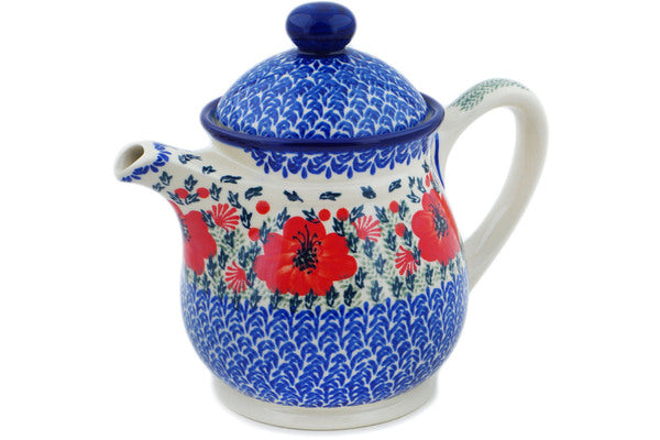 This Polish Pottery Tea or Coffee Pot is handmade and handpainted by the Ceramika Bona factory in Boleslawiec, Poland. Manufacturer item number H8833P. It is 8" high and measures 9½" by 5¾". The capacity of this Tea or Coffee Pot is 45.65 oz (brimful) and it weighs 3.1 lbs. It is part of the Lone Poppy Collection.