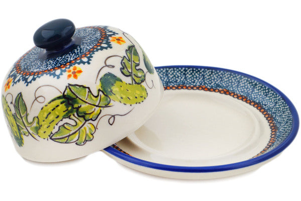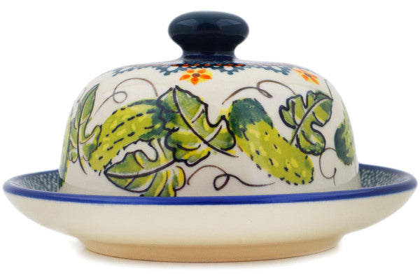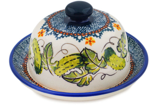This Polish Pottery Dish with Cover is handmade and handpainted by the Zaklady Ceramiczne factory in Boleslawiec, Poland. Manufacturer item number H1460N. It is 3¼" high and measures 5½" by 5½". The weight of this Dish with Cover is 1.0 lbs. It is part of the Cucumber Patch Collection.