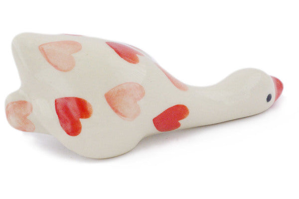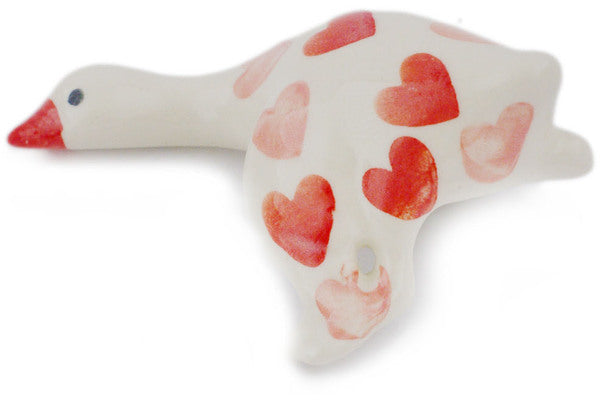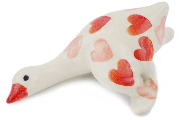 This Polish Pottery Goose Figurine is handmade and handpainted by the Ceramika Bona factory in Boleslawiec, Poland. Manufacturer item number H4606R. It is 2" high and measures 4½" by 2¾". The weight of this Goose Figurine is 0.3 lbs. It is part of the Loving You Collection.