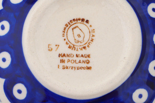 This Polish Pottery Heart Shaped Bowl is handmade and handpainted by the Manufaktura factory in Boleslawiec, Poland. Manufacturer item number H7283O. It is 2" high and measures 5" by 4½". The capacity of this Heart Shaped Bowl is 6.76 oz (brimful) and it weighs 0.5 lbs. It is part of the Peacock Forget-Me-Not Collection.