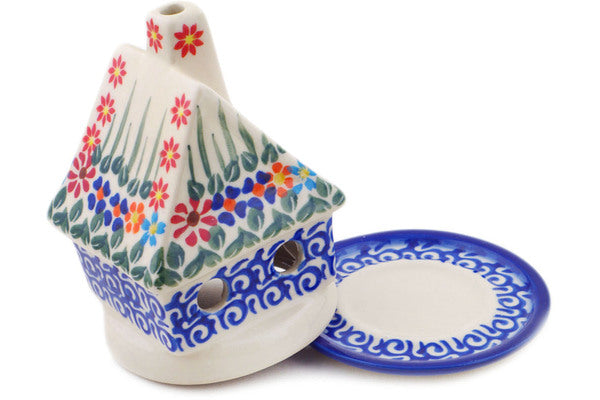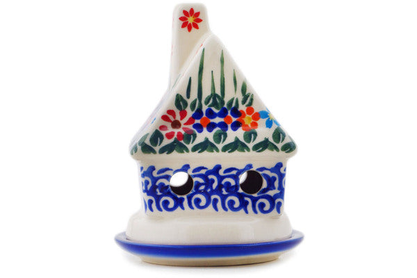 This Polish Pottery House Shaped Candle Holder is handmade and handpainted by the Ceramika Bona factory in Boleslawiec, Poland. Manufacturer item number H4057Q. It is 5" high and measures 4¼" by 4". The weight of this House Shaped Candle Holder is 0.8 lbs. It is part of the Blissful Daisy Collection.