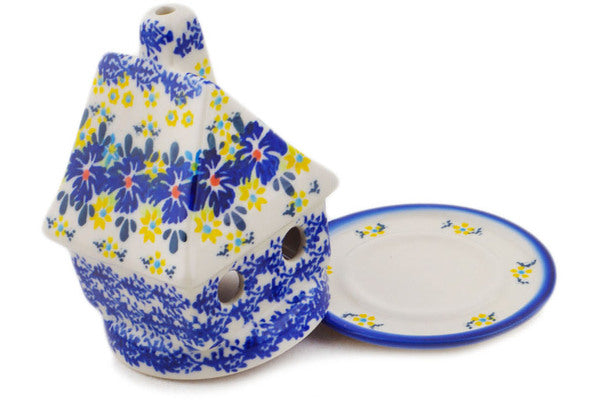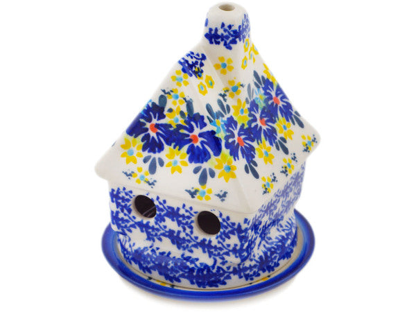 This Polish Pottery House Shaped Candle Holder is handmade and handpainted by the Ceramika Bona factory in Boleslawiec, Poland. Manufacturer item number H8741Q. It is 5" high and measures 4¼" by 4". The weight of this House Shaped Candle Holder is 0.8 lbs. It is part of the Cornflower Meadow Collection.