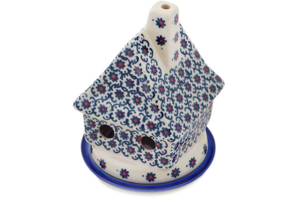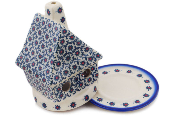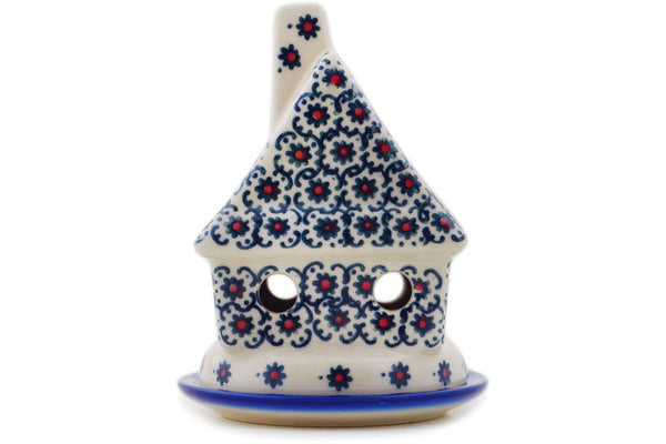 This Polish Pottery House Shaped Candle Holder is handmade and handpainted by the Ceramika Bona factory in Boleslawiec, Poland. Manufacturer item number H9749Q. It is 5" high and measures 4¼" by 4". The weight of this House Shaped Candle Holder is 0.8 lbs. It is part of the Field Of Black Daisies Collection.