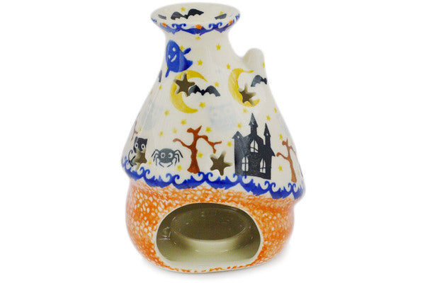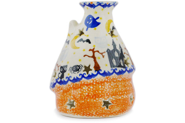 This Polish Pottery House Shaped Candle Holder is handmade and handpainted by the Ceramika Bona factory in Boleslawiec, Poland. Manufacturer item number H5870R. It is 5¼" high and measures 4" by 3½". The weight of this House Shaped Candle Holder is 0.7 lbs. It is part of the Halloween Spooky Vibe Collection.