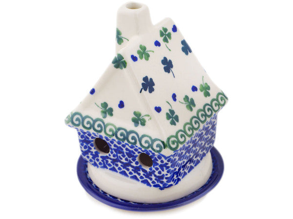 This Polish Pottery House Shaped Candle Holder is handmade and handpainted by the Ceramika Bona factory in Boleslawiec, Poland. Manufacturer item number H9656O. It is 5" high and measures 4¼" by 4". The weight of this House Shaped Candle Holder is 0.8 lbs. It is part of the Lucky Clovers Collection.