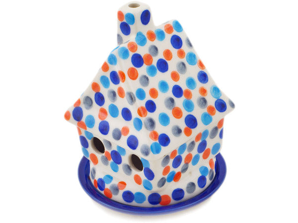 This Polish Pottery House Shaped Candle Holder is handmade and handpainted by the Ceramika Bona factory in Boleslawiec, Poland. Manufacturer item number H2171R. It is 5" high and measures 4¼" by 4". The weight of this House Shaped Candle Holder is 0.8 lbs. It is part of the Polka Dot Frenzy Collection.
