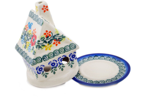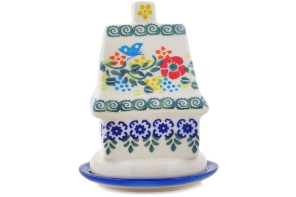This Polish Pottery House Shaped Candle Holder is handmade and handpainted by the Ceramika Bona factory in Boleslawiec, Poland. Manufacturer item number H0217Q. It is 5" high and measures 4¼" by 4". The weight of this House Shaped Candle Holder is 0.8 lbs. It is part of the Ring Of Meadow Flowers Collection.
