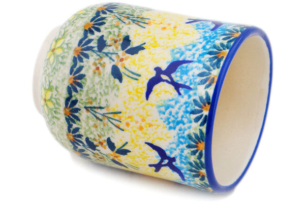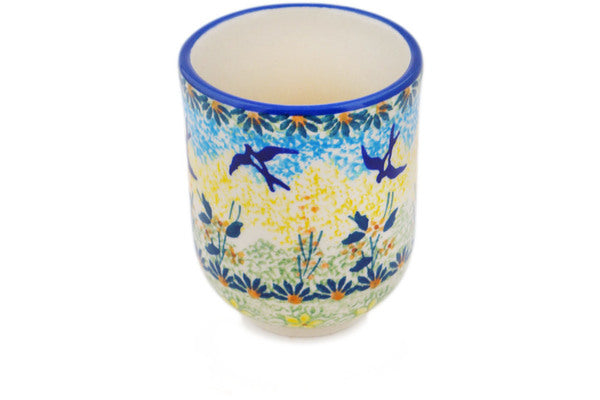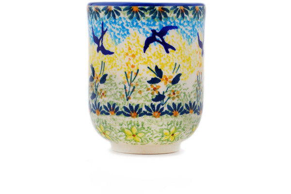This Polish Pottery Tumbler is handmade and handpainted by the Manufaktura factory in Boleslawiec, Poland. Manufacturer item number H8610Q. It is 3¼" high and measures 2¾" by 2¾". The capacity of this Tumbler is 5.51 oz (brimful) and it weighs 0.5 lbs. It is part of the Birds In The Sunset Collection.