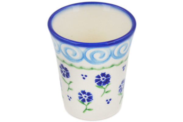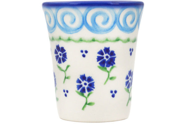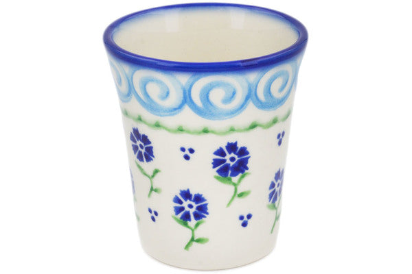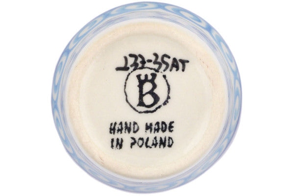 This Polish Pottery shot glass is handmade and handpainted by the Ceramika Bona factory in Boleslawiec, Poland. Manufacturer item number H9191K. It is 3" high and measures 2¾" by 2¾". The capacity of this shot glass is 4.80 oz (brimful) and it weighs 0.3 lbs. It is part of the Blue Bursts Collection.
