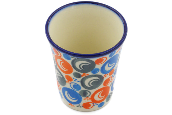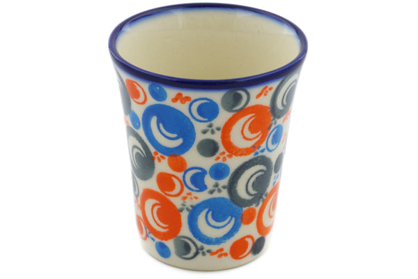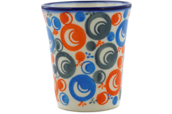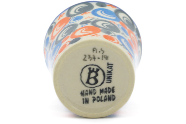This Polish Pottery shot glass is handmade and handpainted by the Ceramika Bona factory in Boleslawiec, Poland. Manufacturer item number H9767I. It is 3" high and measures 2¾" by 2¾". The capacity of this shot glass is 4.80 oz (brimful) and it weighs 0.3 lbs. It is part of the Red Peacock Eye Collection.