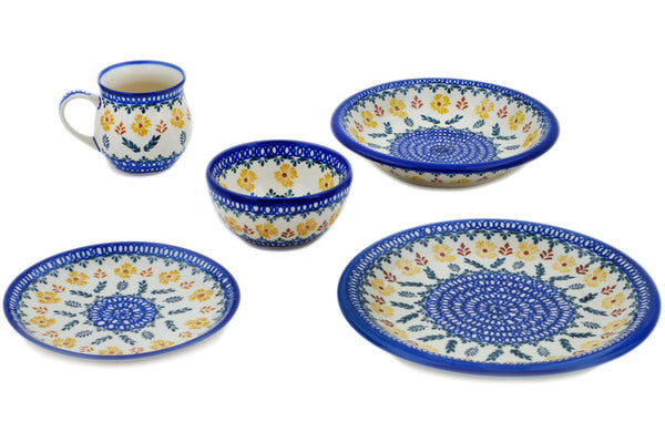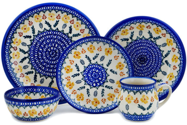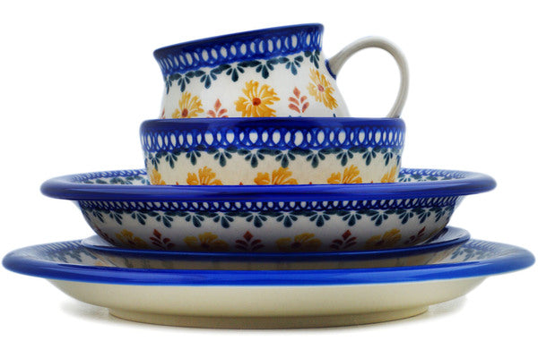 This Polish Pottery Place Setting is handmade and handpainted by the Ceramika Bona factory in Boleslawiec, Poland. Manufacturer item number H0984O. It is 3½" high and measures 10¼" by 10¼". The capacity of this Place Setting is 23.67 oz (brimful) and it weighs 5.6 lbs. It is part of the Golden Flower Garden Collection.