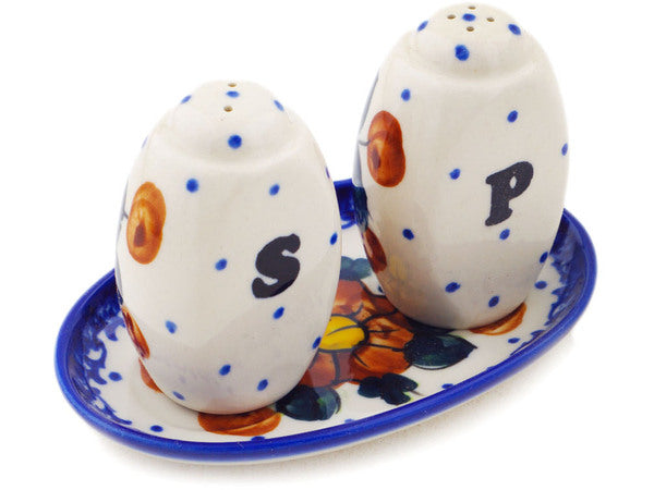 This Polish Pottery Salt and Pepper Set is handmade and handpainted by the Ceramika Bona factory in Boleslawiec, Poland. Manufacturer item number H1724Q. It is 3" high and measures 5" by 3¼". The weight of this Salt and Pepper Set is 0.5 lbs. It is part of the Autumn Pansies Collection.