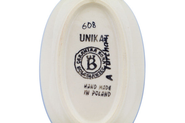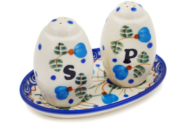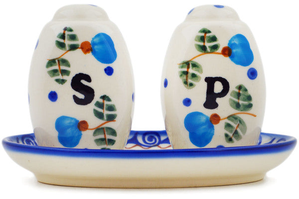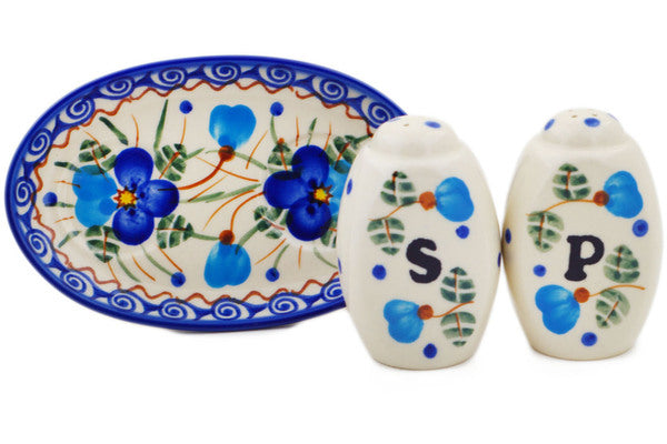This Polish Pottery Salt and Pepper Set is handmade and handpainted by the Ceramika Bona factory in Boleslawiec, Poland. Manufacturer item number H7967O. It is 3" high and measures 5" by 3¼". The weight of this Salt and Pepper Set is 0.5 lbs. It is part of the Blue Pansy Collection.