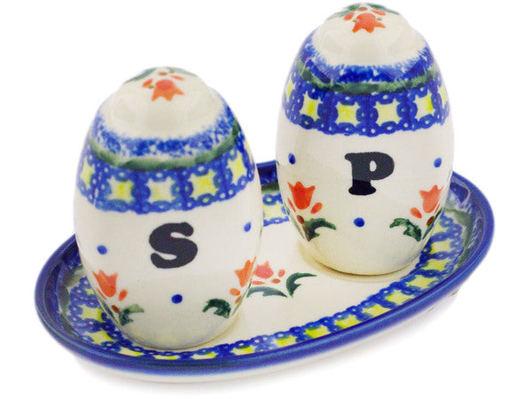 This Polish Pottery Salt and Pepper Set is handmade and handpainted by the Ceramika Bona factory in Boleslawiec, Poland. Manufacturer item number H5727R. It is 3" high and measures 5" by 3¼". The weight of this Salt and Pepper Set is 0.5 lbs. It is part of the Cocentric Tulips Collection.