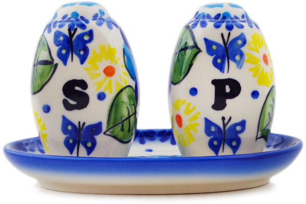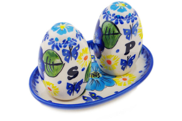 This Polish Pottery Salt and Pepper Set is handmade and handpainted by the Ceramika Bona factory in Boleslawiec, Poland. Manufacturer item number H3966Q. It is 3" high and measures 5" by 3¼". The weight of this Salt and Pepper Set is 0.5 lbs. It is part of the Endless Summer Collection.