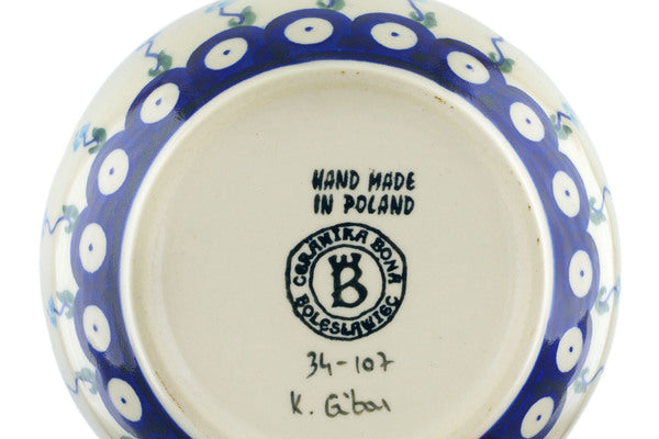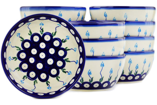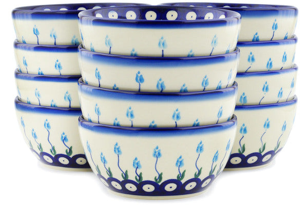 This Polish Pottery Set of 12 Bowls is handmade and handpainted by the Ceramika Bona factory in Boleslawiec, Poland. Manufacturer item number H3671J. It is 2¼" high and measures 5¼" by 5¼". The capacity of this Set of 12 Bowls is 13.53 oz (brimful) and it weighs 10.2 lbs. It is part of the Peacock Tulip Garden Collection.