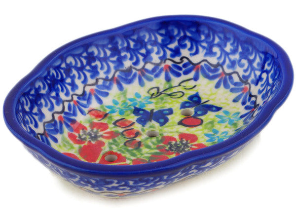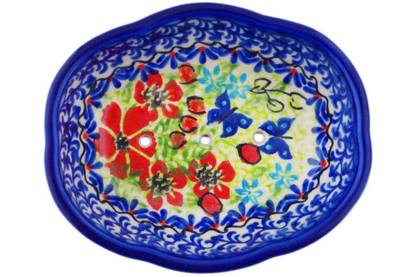This Polish Pottery Soap Dish is handmade and handpainted by the Ceramika Bona factory in Boleslawiec, Poland. Manufacturer item number H8724Q. It is 1¼" high and measures 5" by 4¼". The weight of this Soap Dish is 0.3 lbs. It is part of the Metamorphosis Collection.