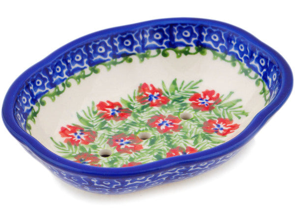 This Polish Pottery Soap Dish is handmade and handpainted by the Ceramika Bona factory in Boleslawiec, Poland. Manufacturer item number H9927Q. It is 1¼" high and measures 5" by 4¼". The weight of this Soap Dish is 0.3 lbs. It is part of the Midsummer Bloom Collection.