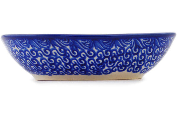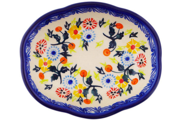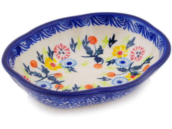 This Polish Pottery Soap Dish is handmade and handpainted by the Ceramika Bona factory in Boleslawiec, Poland. Manufacturer item number H1938R. It is 1½" high and measures 5" by 4¼". The capacity of this Soap Dish is 4.19 oz (brimful) and it weighs 0.4 lbs. It is part of the Pastel Spring Wreath Collection.