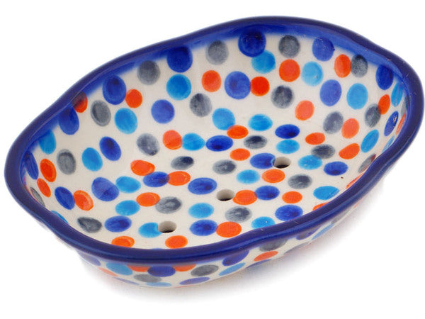 This Polish Pottery Soap Dish is handmade and handpainted by the Ceramika Bona factory in Boleslawiec, Poland. Manufacturer item number H1964R. It is 1¼" high and measures 5" by 4¼". The weight of this Soap Dish is 0.3 lbs. It is part of the Polka Dot Frenzy Collection.