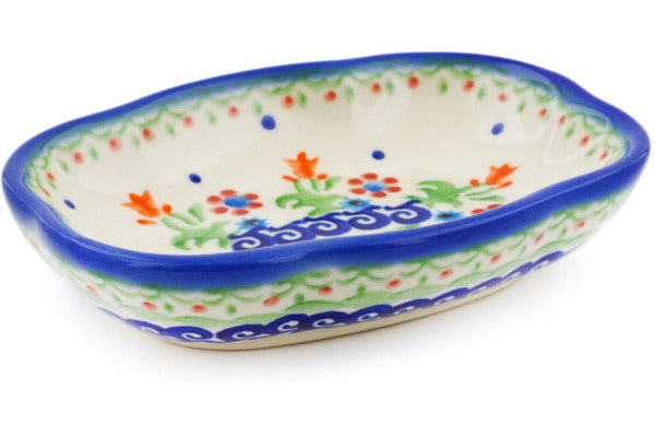 This Polish Pottery Soap Dish is handmade and handpainted by the Ceramika Bona factory in Boleslawiec, Poland. Manufacturer item number H0406C. It is 1¼" high and measures 5¼" by 4". The weight of this Soap Dish is 0.6 lbs. It is part of the Spring Flowers Collection.