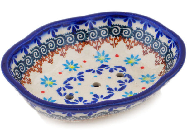 This Polish Pottery Soap Dish is handmade and handpainted by the Ceramika Bona factory in Boleslawiec, Poland. Manufacturer item number H7124Q. It is 1¼" high and measures 5" by 4¼". The weight of this Soap Dish is 0.3 lbs. It is part of the Sunflower Dance Collection.