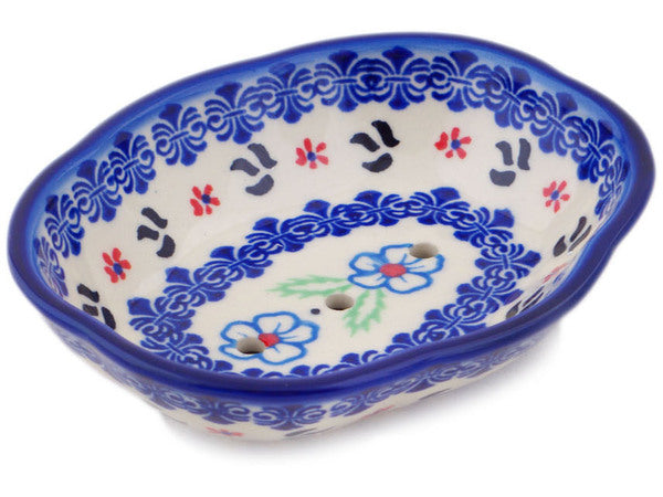 This Polish Pottery Soap Dish is handmade and handpainted by the Ceramika Bona factory in Boleslawiec, Poland. Manufacturer item number H1963R. It is 1¼" high and measures 5" by 4¼". The weight of this Soap Dish is 0.3 lbs. It is part of the Sweet Day Collection.