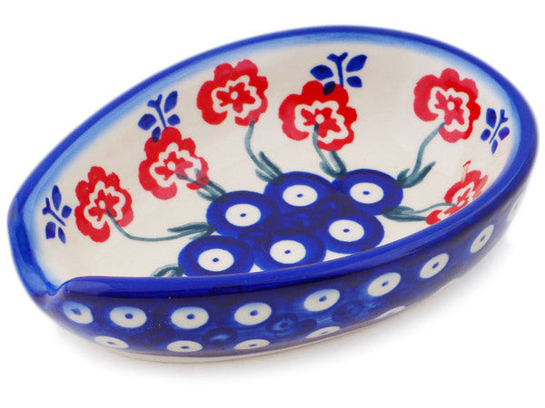 This Polish Pottery Spoon Rest is handmade and handpainted by the Ceramika Bona factory in Boleslawiec, Poland. Manufacturer item number H0153P. It is 1½" high and measures 5" by 3½". The capacity of this Spoon Rest is 5.07 oz (brimful) and it weighs 0.5 lbs. It is part of the Blue Eye Spring Collection.