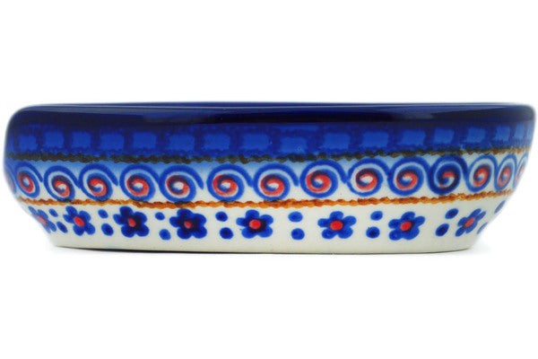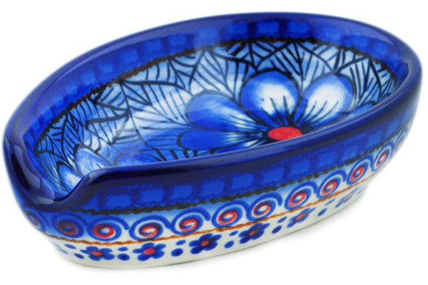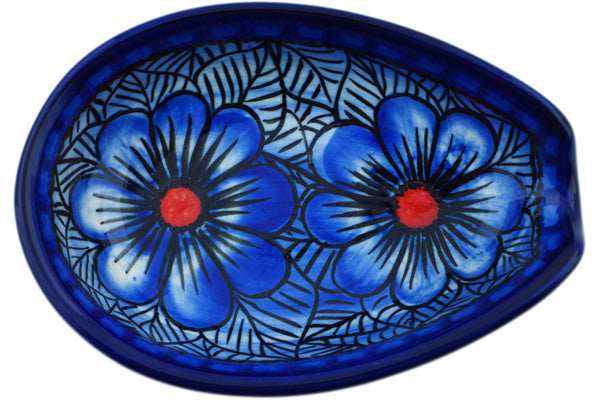 This Polish Pottery Spoon Rest is handmade and handpainted by the Cergor factory in Boleslawiec, Poland. Manufacturer item number H8375N. It is 1½" high and measures 5¼" by 3½". The weight of this Spoon Rest is 0.7 lbs. It is part of the Blue Heaven Collection.