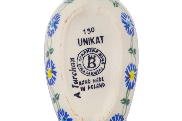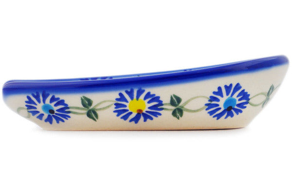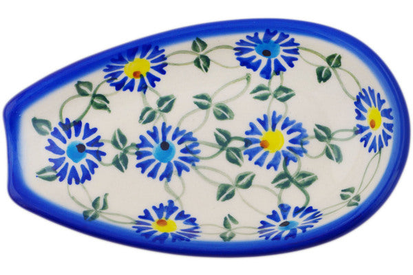 This Polish Pottery Spoon Rest is handmade and handpainted by the Ceramika Bona factory in Boleslawiec, Poland. Manufacturer item number H2225R. It is 1½" high and measures 5½" by 3¼". The weight of this Spoon Rest is 0.3 lbs. It is part of the Blue Thistle Beauty Collection.