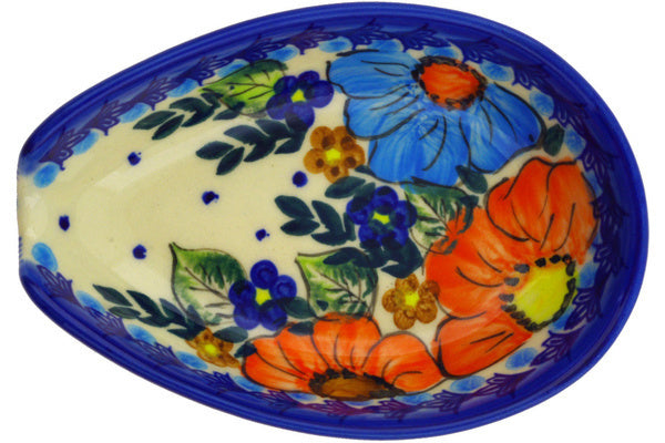 This Polish Pottery Spoon Rest is handmade and handpainted by the Ceramika Bona factory in Boleslawiec, Poland. Manufacturer item number H0676F. It is 1½" high and measures 5" by 3½". The capacity of this Spoon Rest is 5.07 oz (brimful) and it weighs 0.5 lbs. It is part of the Bold Poppies Collection.