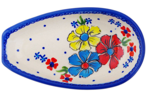 This Polish Pottery Spoon Rest is handmade and handpainted by the Ceramika Bona factory in Boleslawiec, Poland. Manufacturer item number H2174R. It is 1½" high and measures 5½" by 3¼". The weight of this Spoon Rest is 0.3 lbs. It is part of the Country Three Collection.