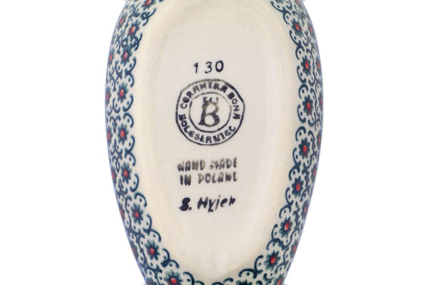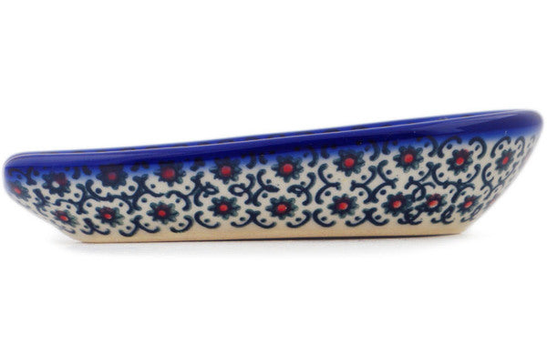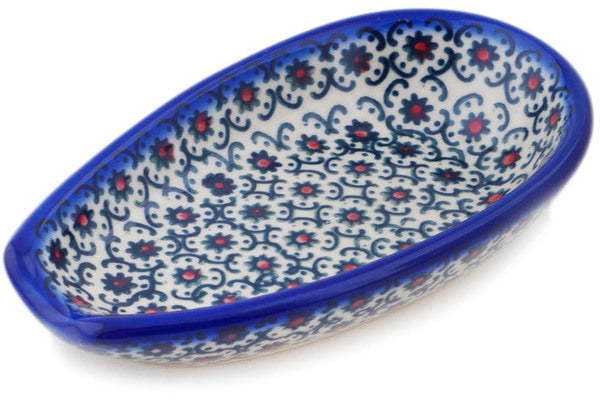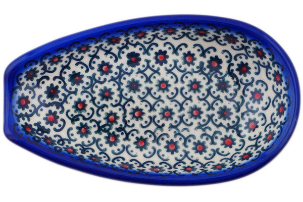 This Polish Pottery Spoon Rest is handmade and handpainted by the Ceramika Bona factory in Boleslawiec, Poland. Manufacturer item number H9691Q. It is 1½" high and measures 5½" by 3¼". The weight of this Spoon Rest is 0.3 lbs. It is part of the Field Of Black Daisies Collection.