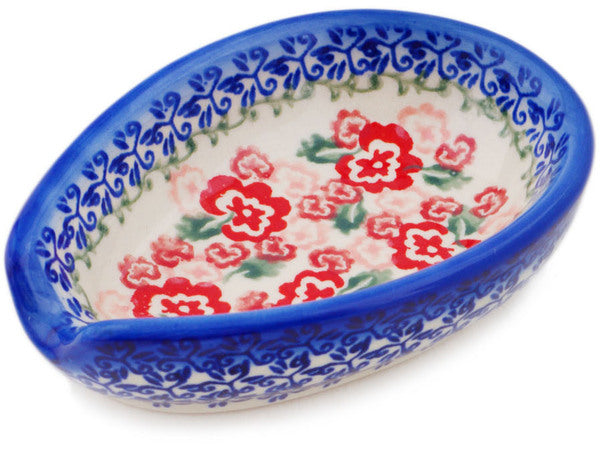This Polish Pottery Spoon Rest is handmade and handpainted by the Ceramika Bona factory in Boleslawiec, Poland. Manufacturer item number H0261P. It is 1½" high and measures 5" by 3½". The capacity of this Spoon Rest is 5.07 oz (brimful) and it weighs 0.5 lbs. It is part of the Fluctuating Pansy's Collection.